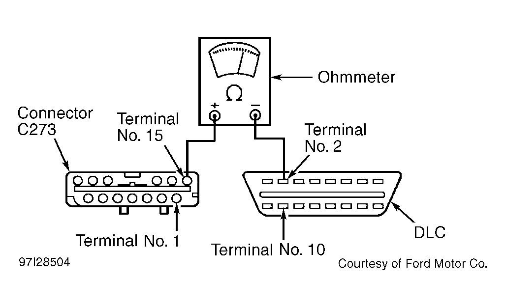 3. Using ohmmeter, check resistance between terminal No. 1 (Pink/Light Blue wire) on connector C273 and terminal No. 10 (Pink/Light Blue wire) on DLC. See Fig 1 . Note resistance and go to next step.