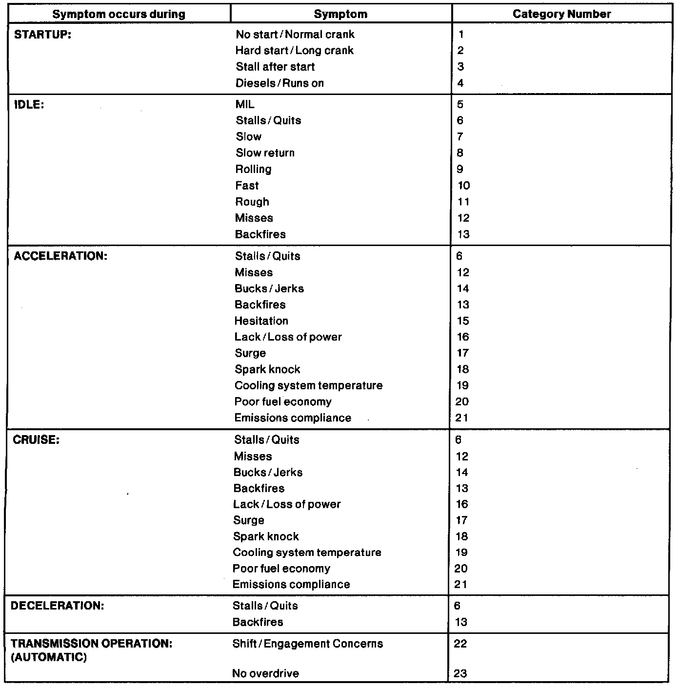 The Reference Value Symptom Chart is used to provide guidance in selecting the appropriate PID or measured signal related to the fault area. Select a symptom from the symptom chart along with the category number and proceed to the PID/Measured Signal Chart. For multiple symptoms, select the most evident. Reference Value PID/Measured Signal Chart