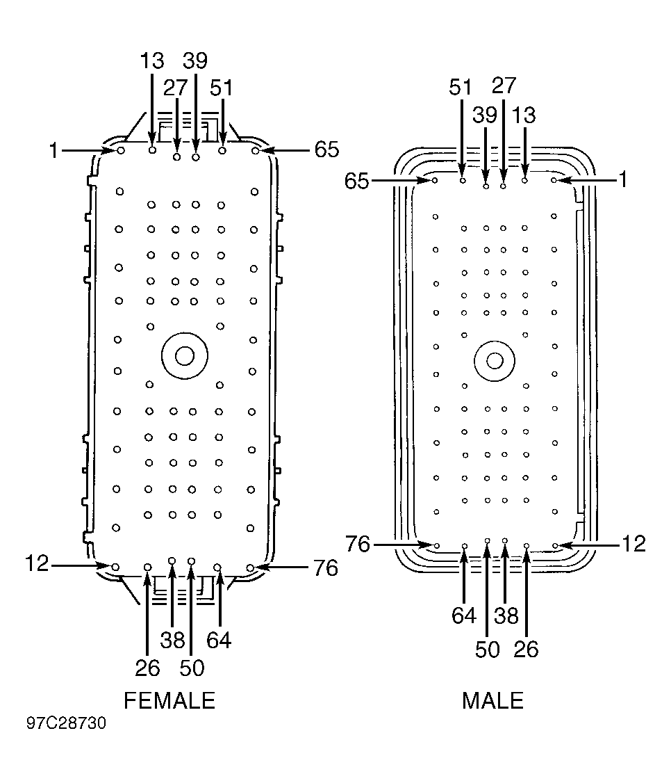 Turn ignition off. Disconnect harness connector C101 (70-pin connector located on left side of firewall). See Figure and Figure. Measure resistance of circuit No. 70 (Light Blue/White wire) between C101 terminal No. 61 and DLC terminal No. 7. If resistance is less than 5 ohms, go to next step. If resistance is greater than 5 ohms, repair open circuit No. 70 (Light Blue/White wire). Repeat DATA LINK DIAGNOSTICS under COMMUNICATION NETWORK DIAGNOSTICS to confirm repair.