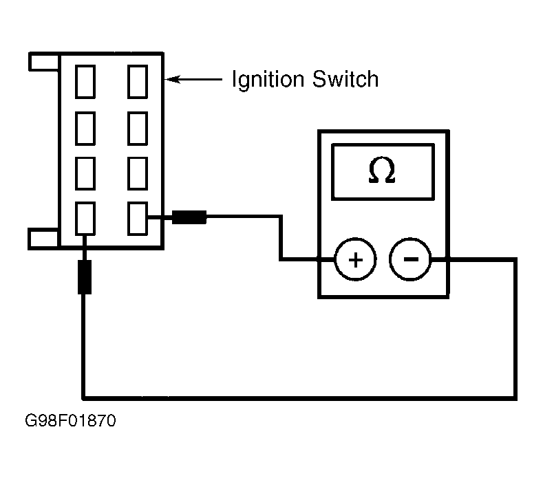 Hold ignition switch in START position. Measure resistance between ignition switch terminals No. 1 and 5. See Fig 2 . If resistance is less than 5 ohms, go to next step. If resistance is greater than 5 ohms, replace ignition switch. Restore electrical connections and check system operation.