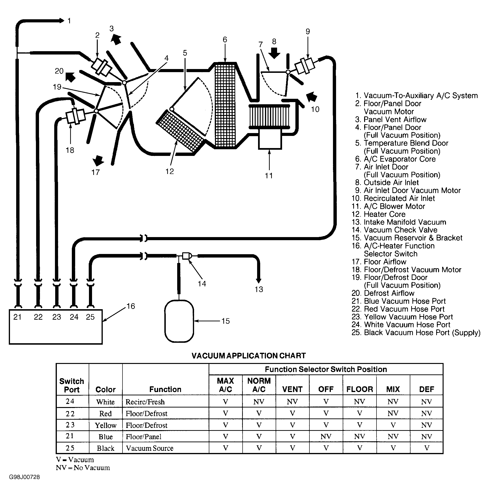 Place function selector switch in specified position. Using a vacuum gauge, check for presence or absence of vacuum as specified. See Figure. If test results are not as specified, check for kinked or broken vacuum lines. If vacuum lines are okay, replace function selector valve.