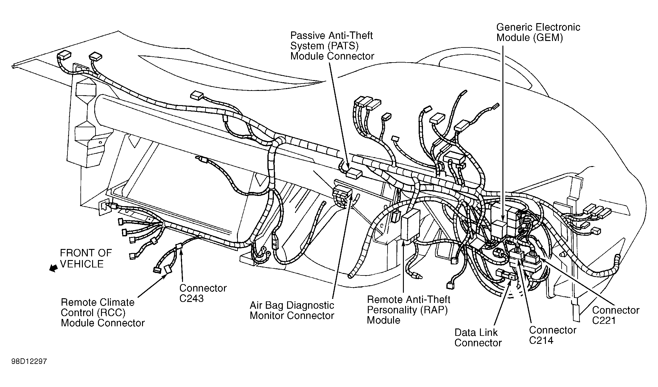 20. Turn ignition off. Reconnect connector C243. Disconnect Remote Climate Control (RCC) module connector located behind right side of instrument panel, behind glove box. See Figure. Turn ignition on. Measure voltage between terminal No. 16 (Light Green/Red wire) and terminals No. 2 (Tan/Orange wire) and No. 10 (Pink/Light Blue wire) at DLC. If any reading indicates voltage, go to next step. If both readings indicate zero volts, repair short to power in Tan/Orange and Pink/Light Blue wires between connector C243 and RCC module. Retest system for normal operation.