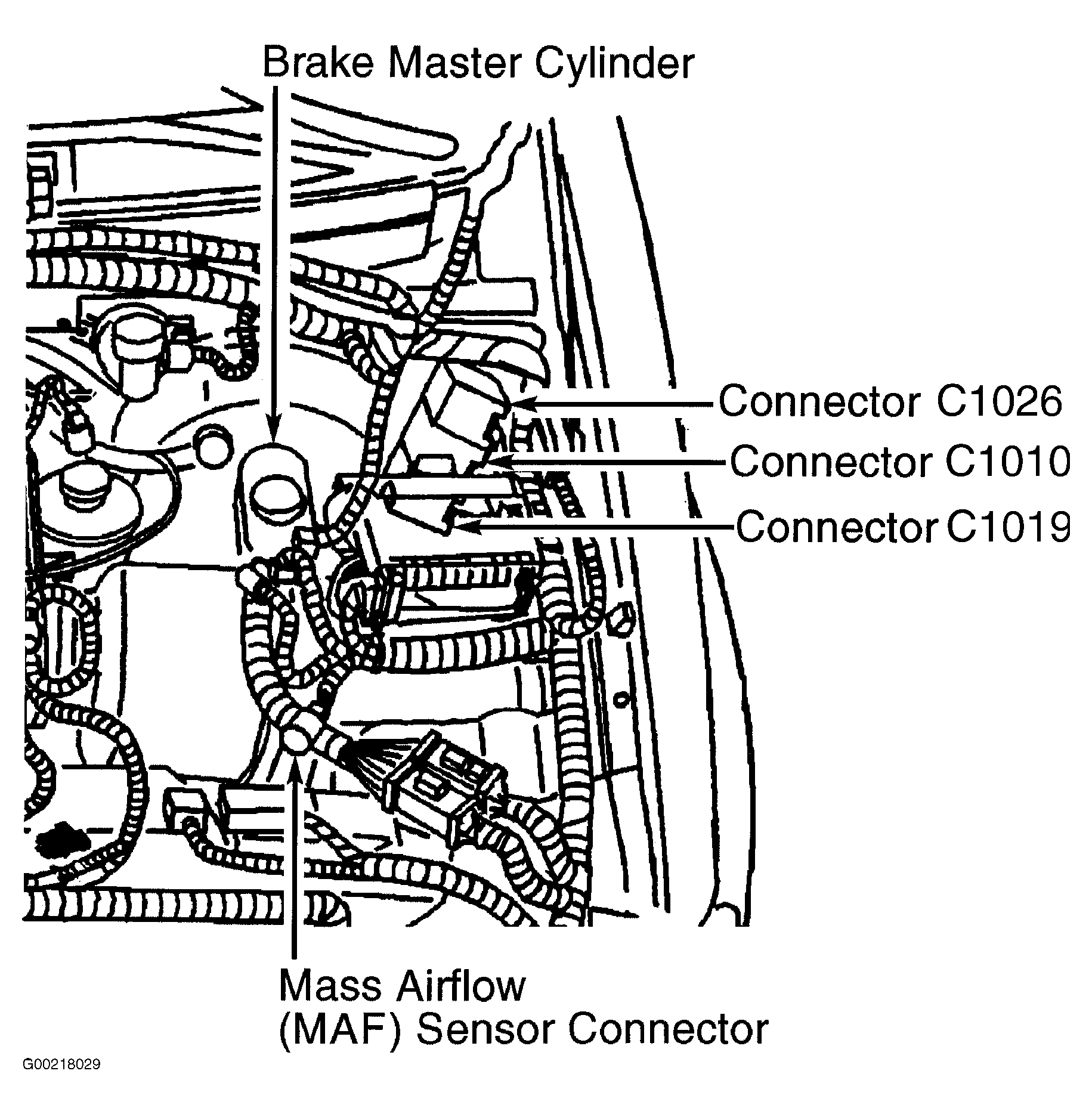 11. Disconnect in-line 40-pin harness connector C1019. See Figure. Inspect in-line 40-pin harness connector C1019 for loose, damaged or corroded terminals. If problem does not exist with harness connector, go to next step. If problem exists with harness connector, repair as necessary.