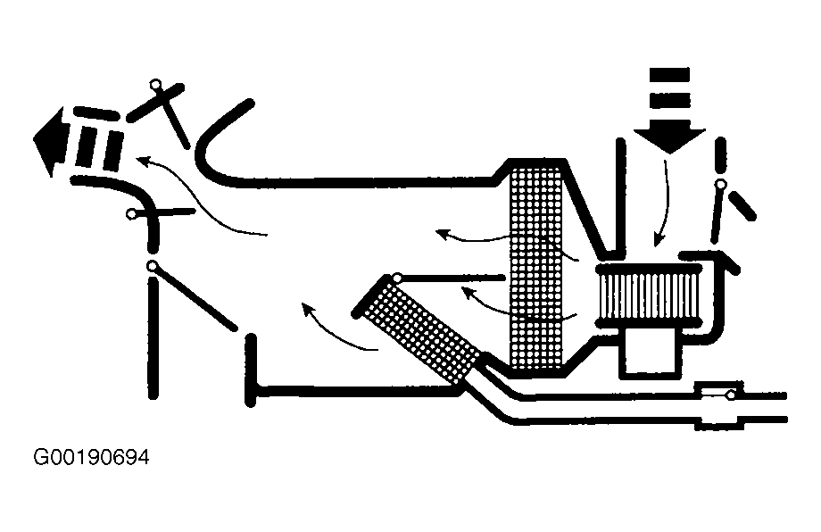 When function selector knob is in maximum A/C position, air inlet blend door is at full vacuum, closing off outside air and allowing only recirculated air. See Fig 1. Defrost blend door is at full vacuum while footwell blend door is at no vacuum, closing both doors. Vent/register blend door is at partial vacuum, directing airflow to driver side, passenger side and center registers. Temperature control is usually set for maximum cold but may be heated if selected. Air is picked up at recirculation opening by blower motor. With temperature control set for maximum cold, air flows across evaporator core, diverting past heater core and then directed into passenger compartment through driver side, passenger side and center registers. Compressor is enabled when MAX A/C is selected. Blower motor is on.