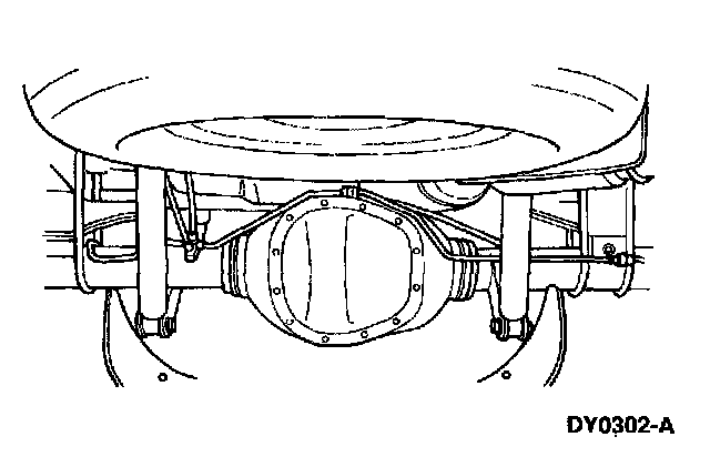 ^ When raising a vehicle on a twin-post hoist, use care when positioning the vehicle so that the hoisting forks do not interfere with the shock absorber mounting brackets or stabilizer mounting brackets, if so equipped, or damage the axle carrier or rear cover.