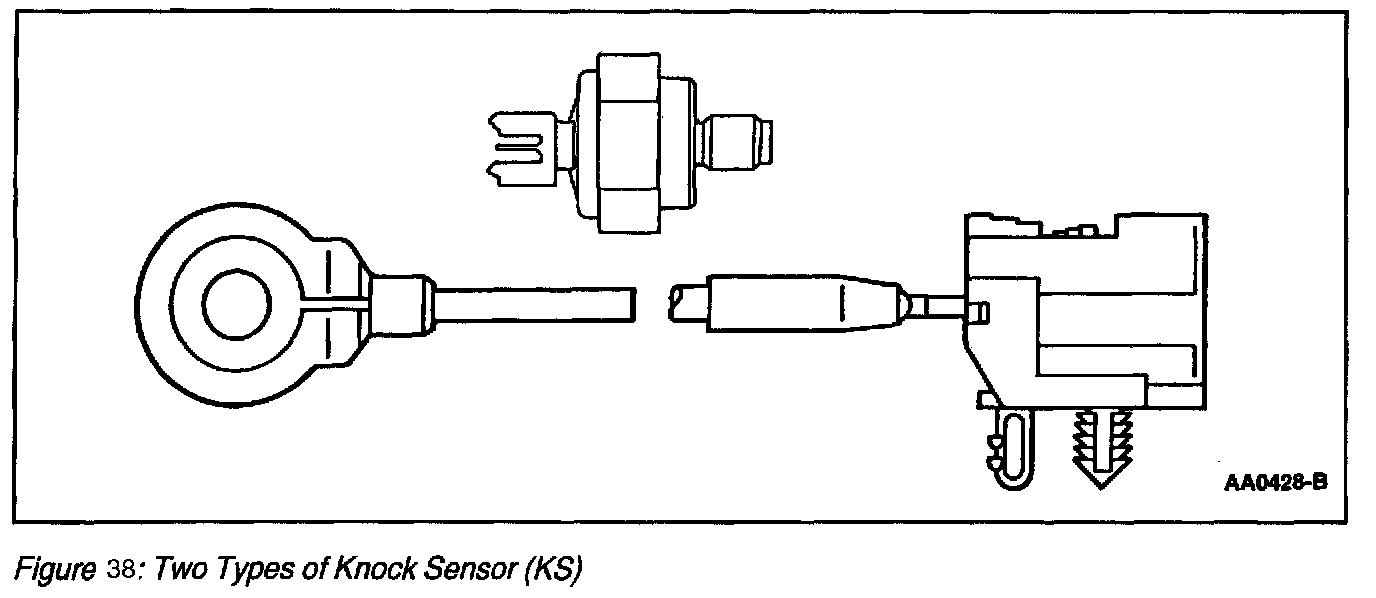 The Knock Sensor (KS) is a tuned accelerometer on the engine which converts engine vibration to an electrical signal. The PCM uses this signal to determine the presence of engine knock and to retard spark timing.