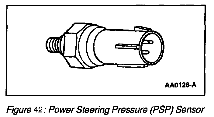 The Power Steering Pressure (PSP) sensor monitors the hydraulic pressure within the power steering system. The PSP sensor voltage input to the PCM will change as the hydraulic pressure changes. The PCM uses the input signal from the PSP sensor to compensate for additional loads on the engine by adjusting the idle rpm and preventing engine stall during parking maneuvers. Also, the PSP sensor signals the PCM to adjust transmission Electronic Pressure Control (EPC) pressure during the increased engine load, for example during parking maneuvers.