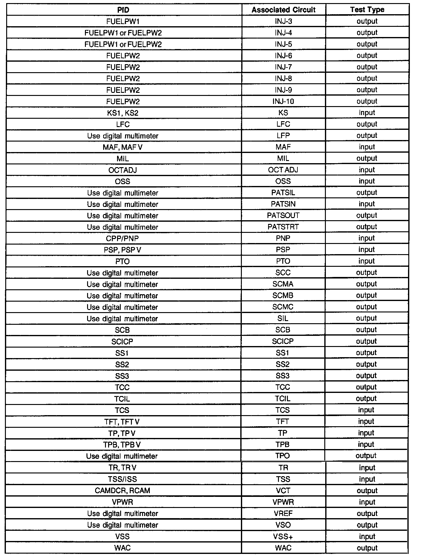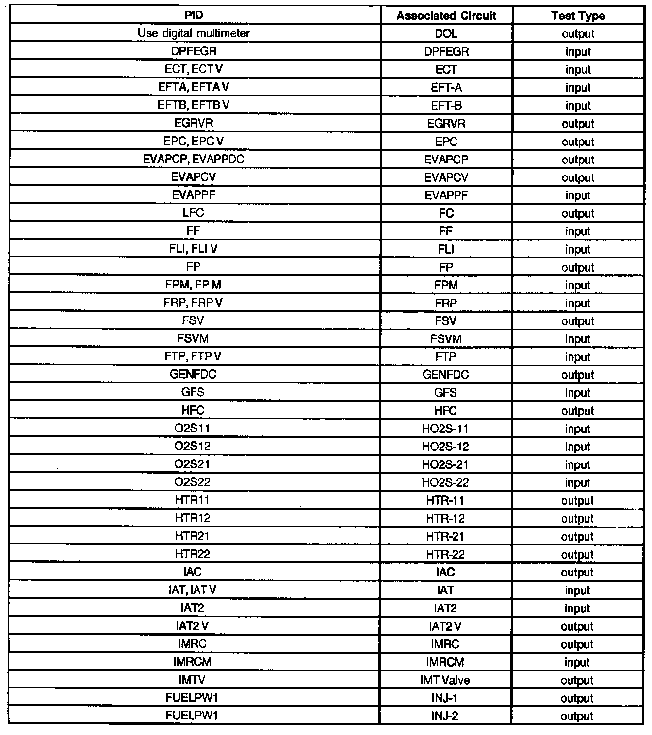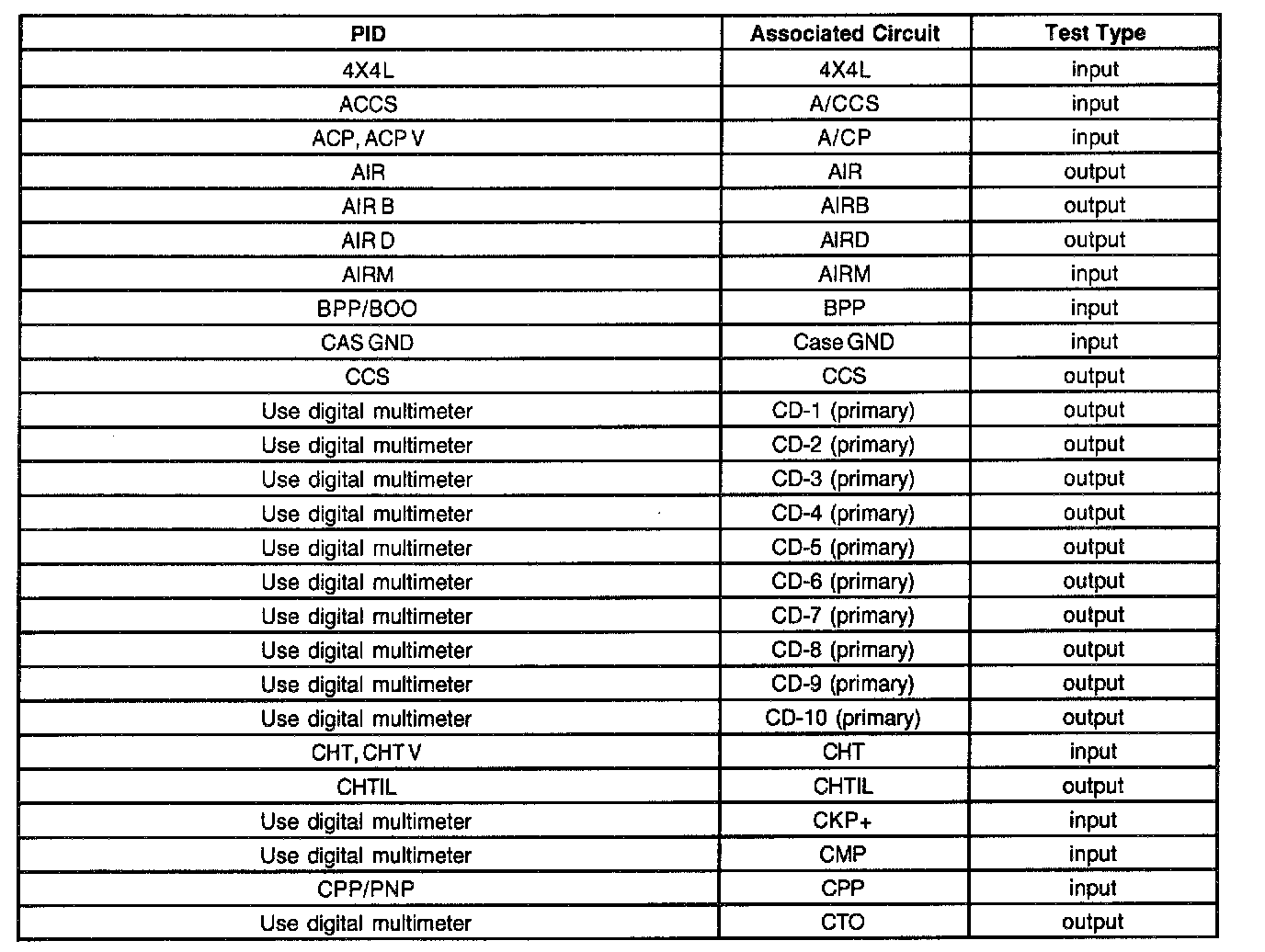 This chart is used to determine which test to run for the suspect circuit. Corresponding PIDs to each circuit are listed. Some circuits do not have an associated PID and will be measured with a digital multimeter. If the vehicle has a coil pack system with no start, perform the ignition test with the distributorless ignition system tester. Do not use the DIST for coil on plug applications.