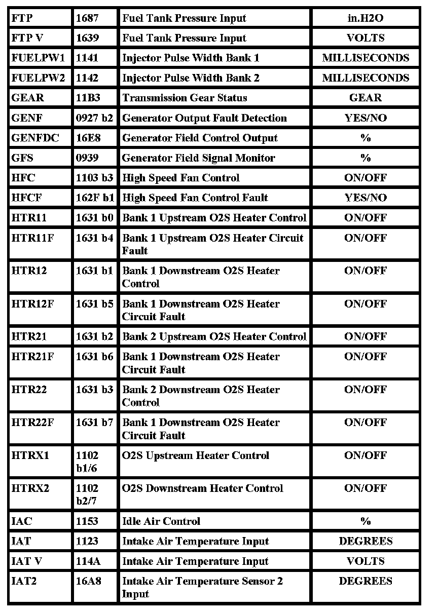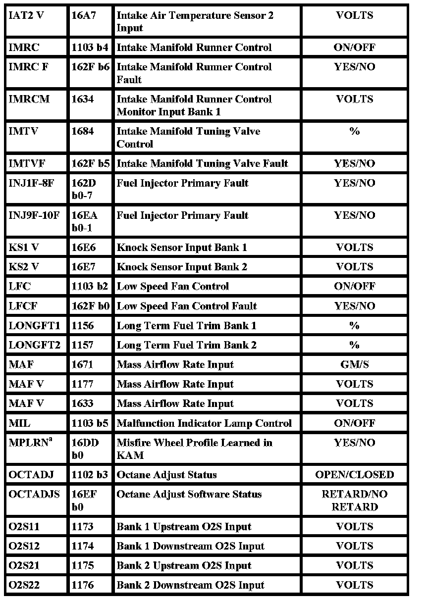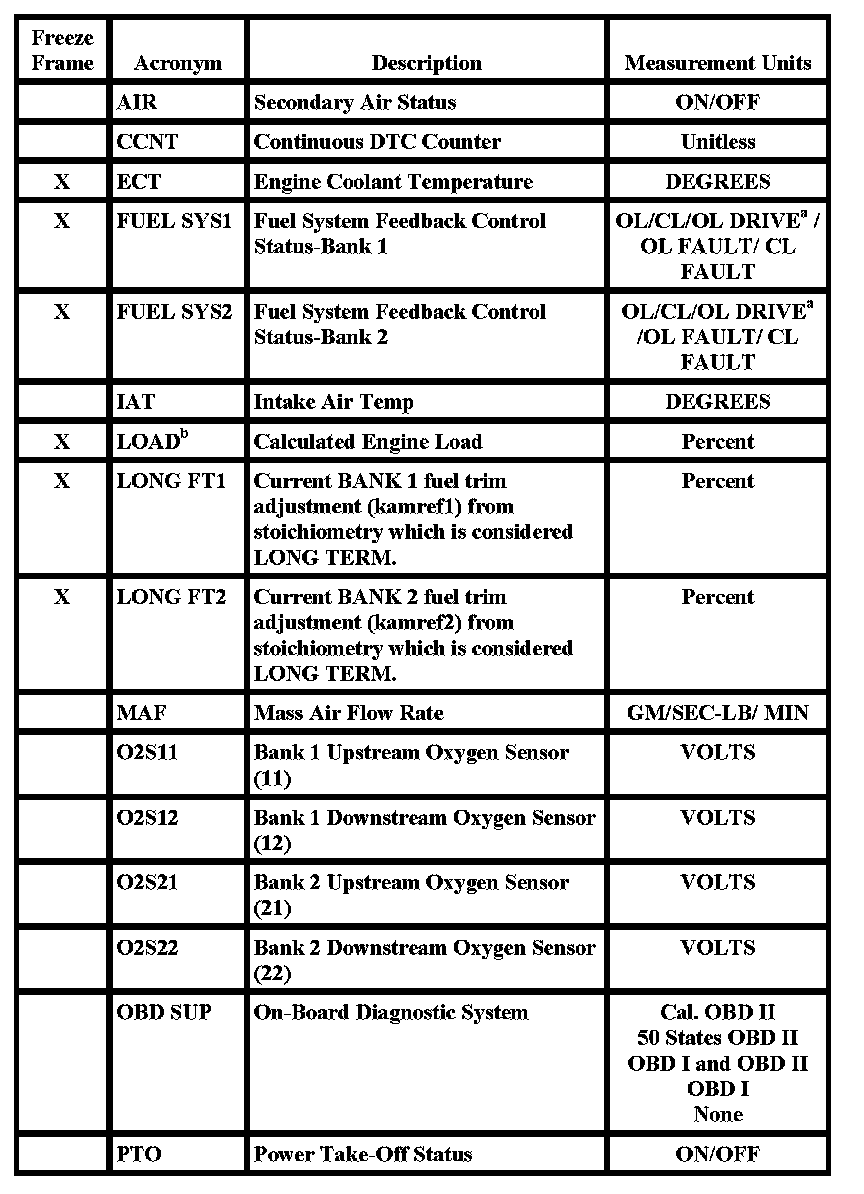 "X" in the "Freeze Frame" column denotes both a mode 1 and mode 2 PID (real time and freeze frame).