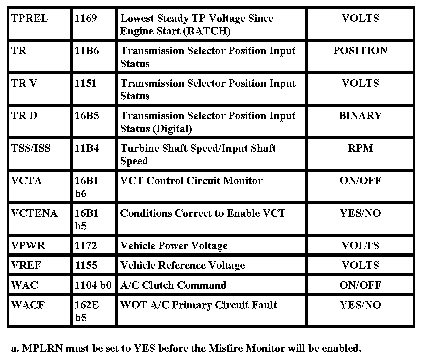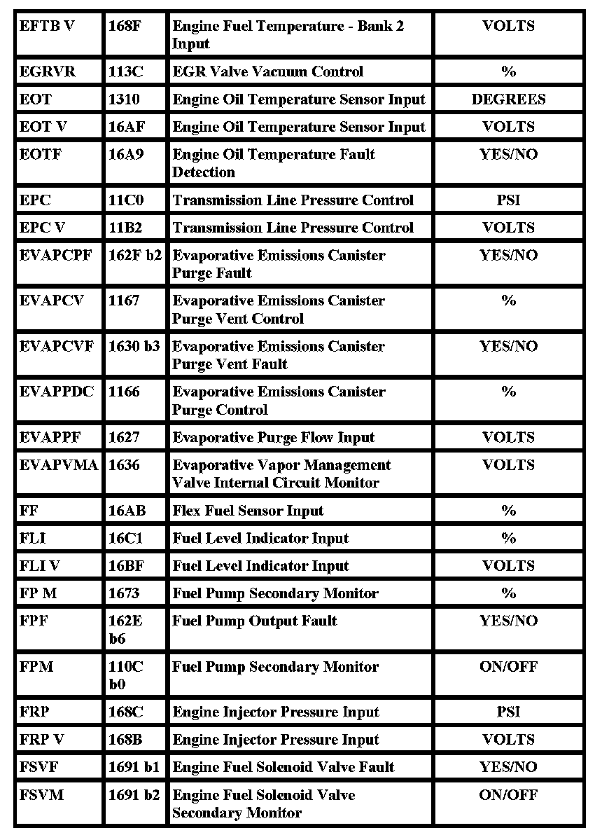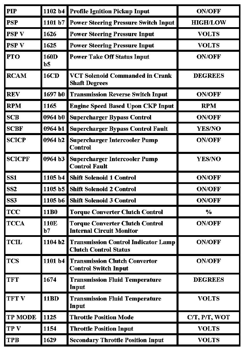 The Parameter Identification (PID) mode allows access to powertrain control module (PCM) information. This includes analog and digital signal inputs and outputs along with calculated values and system status. There are two types of PID lists available and both are used throughout this manual. The first is the Generic (J1979) OBDII PID list. This is a standard set of PIDs for all manufacturers all scan tools must be able to access. The second is a Ford specific (J2190) list which can be accessed by an adequate scan tool. When accessing any of these PIDs, the values will be continuously updated. The Generic or Ford PID list provides definitions and values in appropriate units. For more information, refer to the Society of Automotive Engineers (SAE) J2205 document.