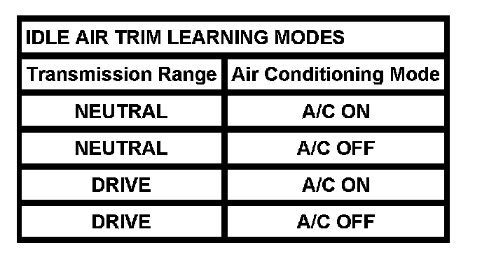 Once Keep Alive RAM has been reset, the engine must idle for 15 minutes (actual time varies between strategies) to learn new idle air trim values. Idle quality will improve as the strategy adapts. Adaptation occurs in four separate modes. The modes are shown in the following table.