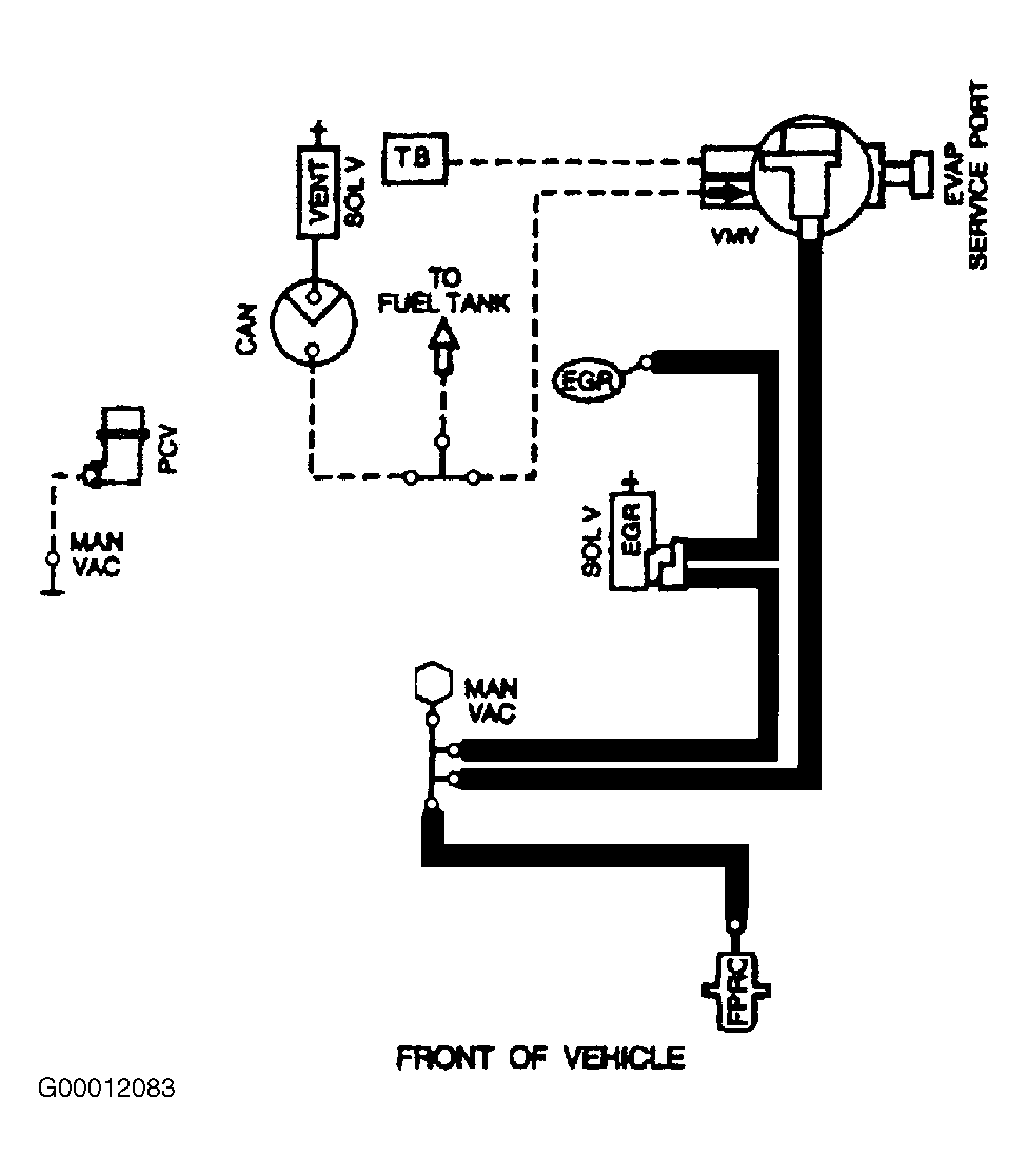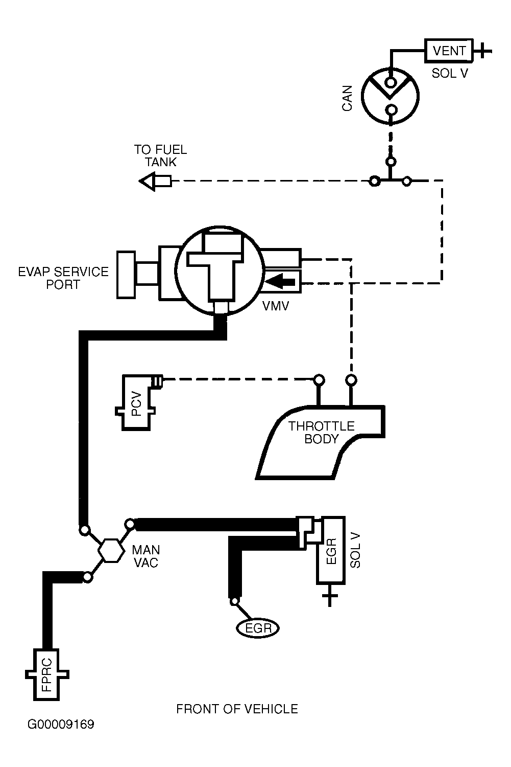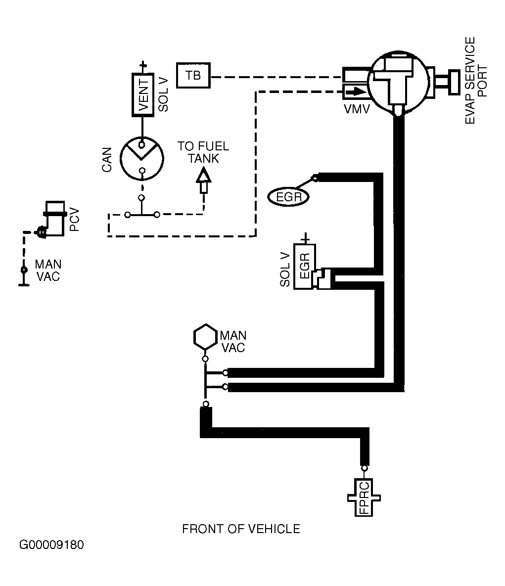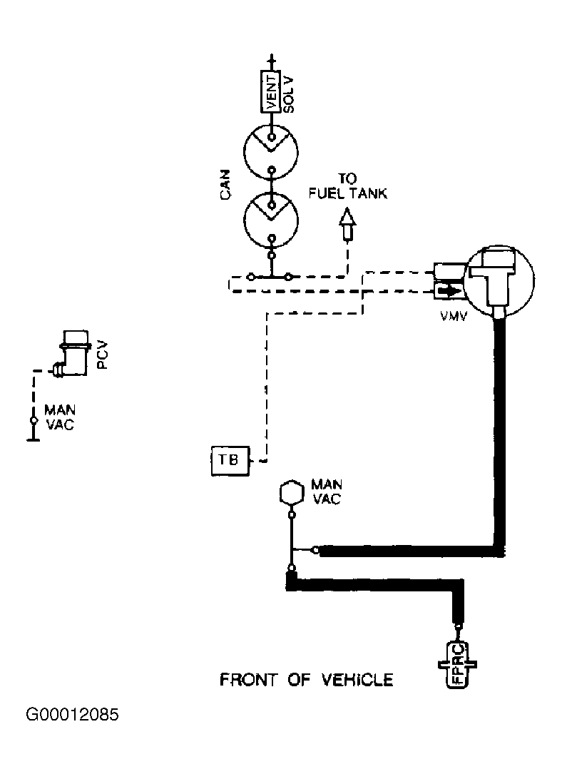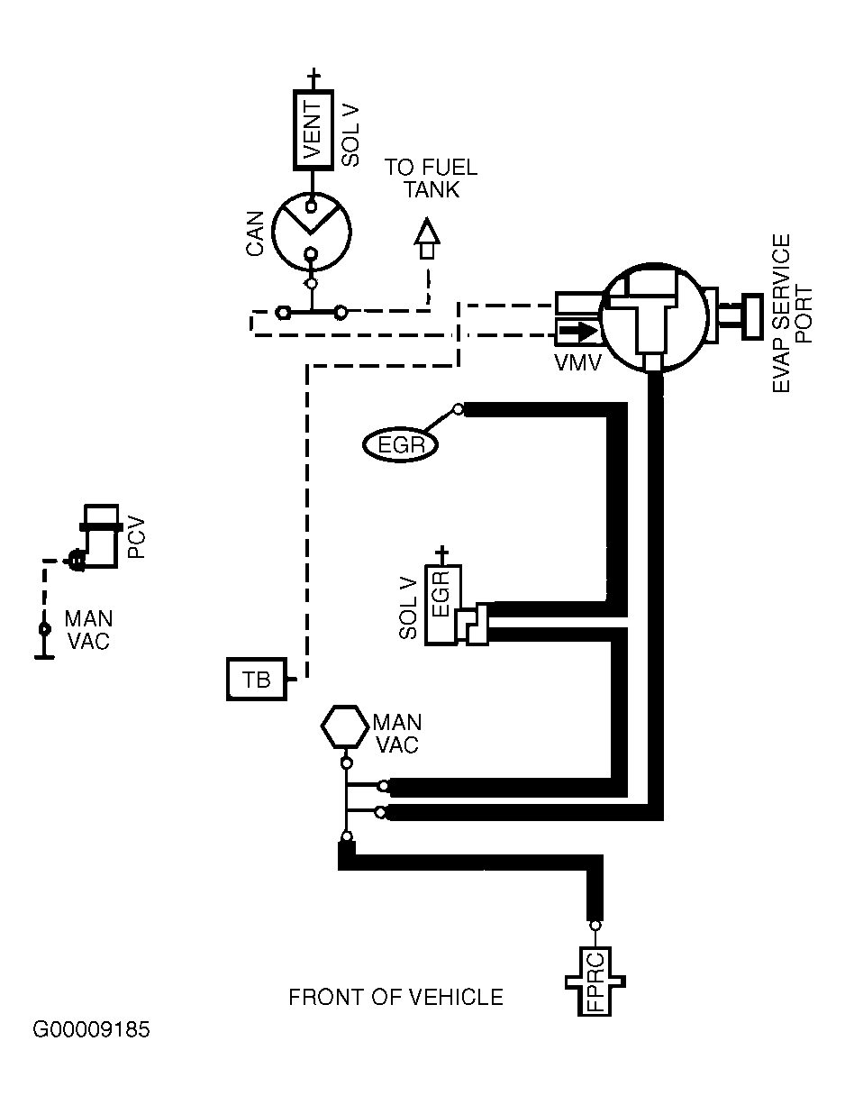 This article contains underhood schematics of vacuum hose routing. Use these vacuum diagrams during the visual inspection performed in the appropriate BASIC DIAGNOSTIC PROCEDURES article. This will assist in identifying improperly routed vacuum hoses, which may cause driveability and/or computer-indicated malfunctions. To properly identify calibration code, catch code must be identified. The catch code is the 4 alpha/numeric characters located in parenthesis at the end of the calibration code. Example; 9-EQA-BBD 9 (BAX3). The BAX3 is the catch code. The catch code tag is attached to the powertrain control module connector. See POWERTRAIN CONTROL MODULE LOCATION table. On some models, the catch code tag may also be located on the "A" pillar or inner fender.