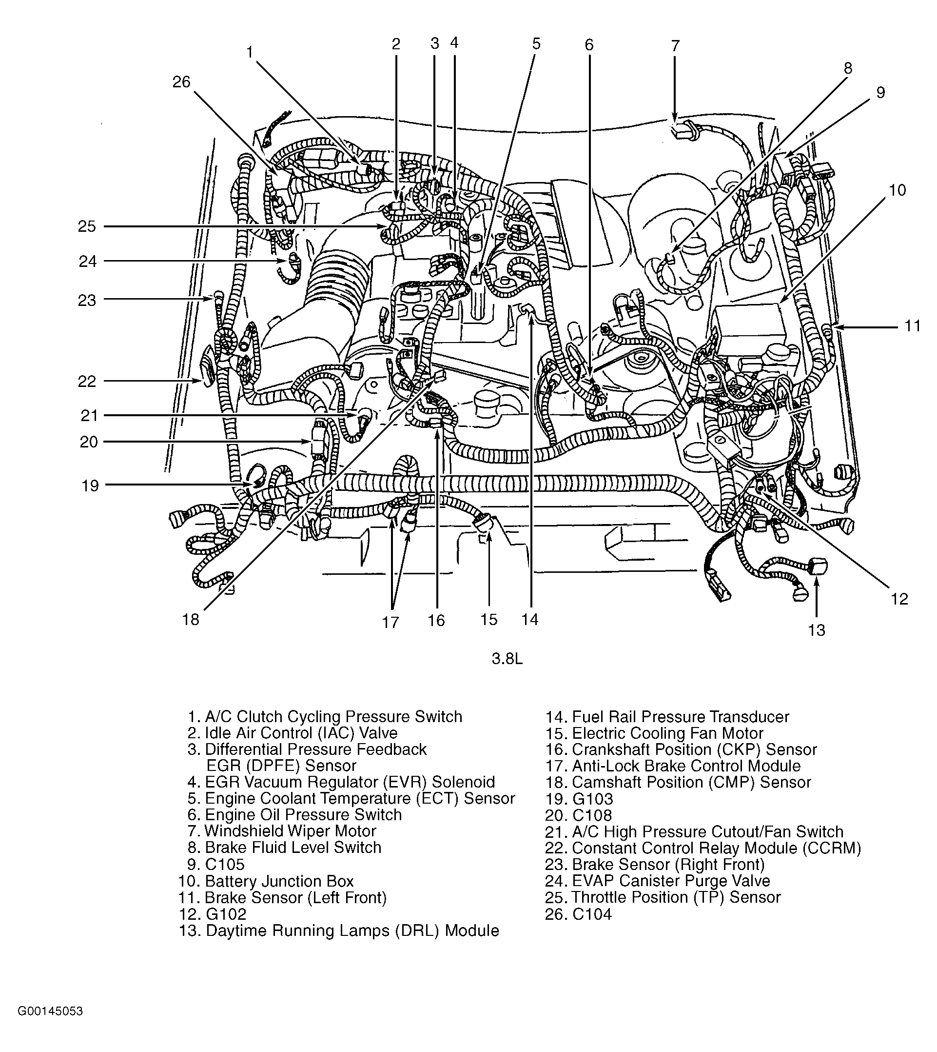| Daytime Running Lamps (DRL) Module (3.8L) | In left front corner of engine compartment, below horns. See Figure. |