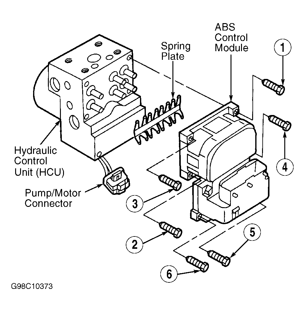 2. Use care when fitting ABS control module coils over HCU valve bodies. Use NEW ABS control module-to-HCU screws. Tighten screws in sequence to specification. See Figure. See TORQUE SPECIFICATIONS .