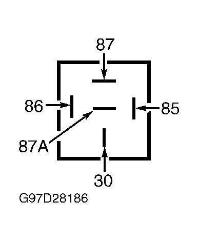 Between Terminals No. Resistance 85 & 86 50-100 Ohms 30 & 87a 5 Ohms Or Less 30 & 87 Greater Than 10 k/Ohms 30 & 86 Greater Than 10 k/Ohms 86 & 87a Greater Than 10 k/Ohms 86 & 87 Greater Than 10 k/Ohms - Using a fused jumper wire, connect positive battery voltage to terminal No. 85. Using another jumper wire, ground terminal No. 86. Resistance should now be 5 ohms or less between terminals No. 30 and 87 and greater than 10 k/ohms between terminals 30 and 87a. If resistance is as specified, relay is okay at this time. If resistance is not as specified, replace relay.