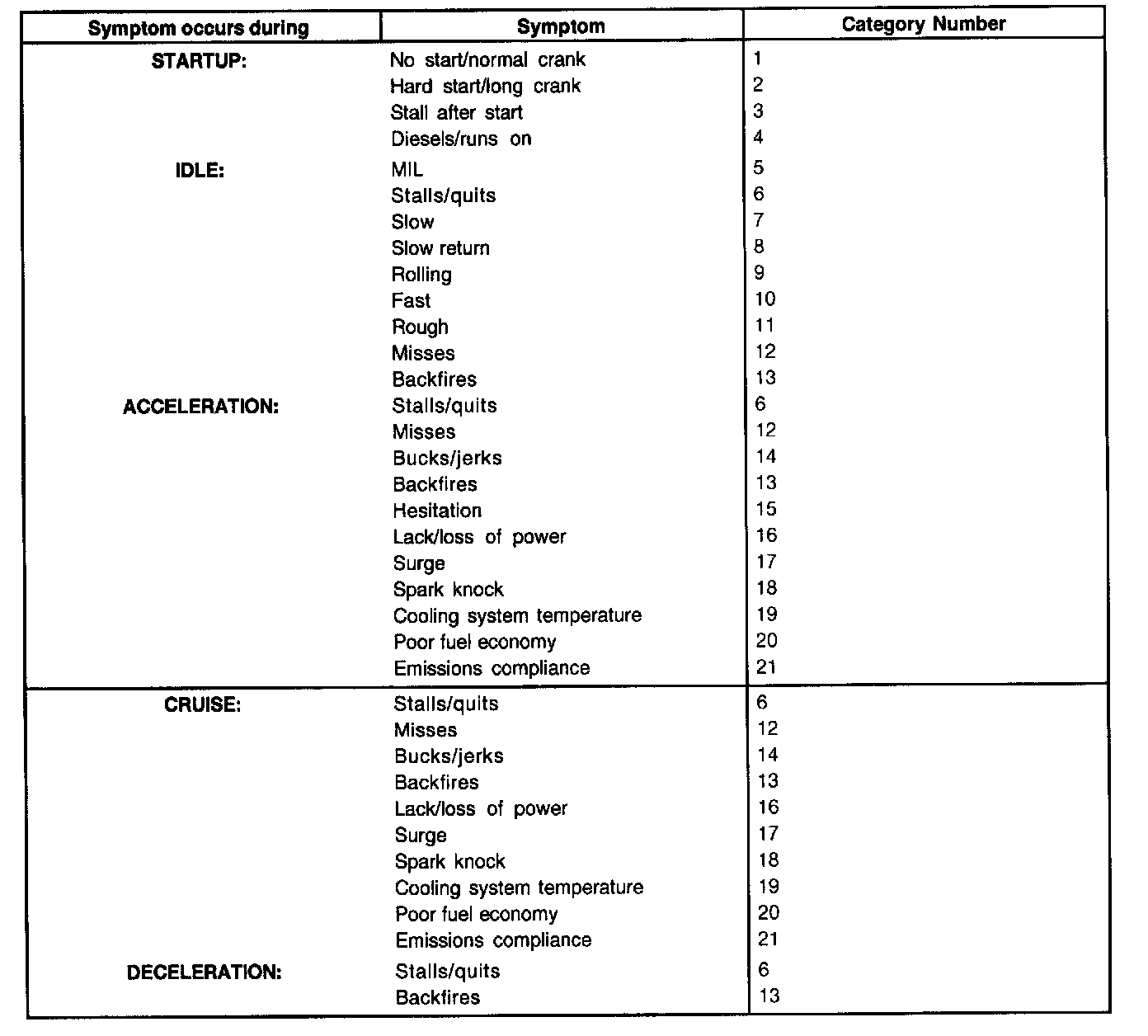 The Reference Value Symptom Chart is used to provide guidance in selecting the appropriate PID or measured signal related to the fault area. Select a symptom from the symptom chart along with the category number and proceed to the PID/Measured Signal Chart. For multiple symptoms, select the most evident. Reference Value PID/Measured Signal Chart