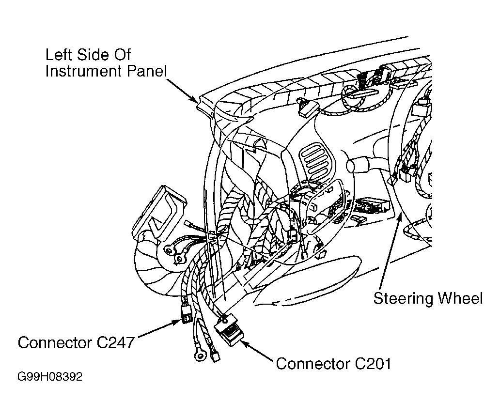 - Disconnect in-line 16-pin harness connector C247. See Fig 2. Inspect both halves of harness connector for loose, damaged or corroded terminals. If problem does not exist with harness connector, go to next step. If problem exists with harness connector, repair as necessary.