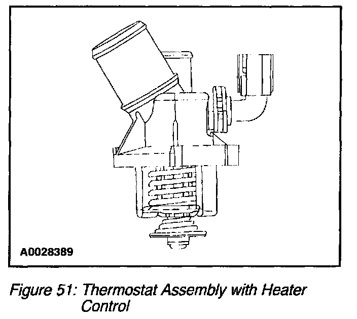 The primary objective for the thermostat heater control is for improvement in fuel economy and thermal efficiency. The system consists of a high temperature (98°C/208°F in lieu of a 90°C/194°F) thermostat (Figure 51)that has a resistive heater within the wax element. The heater is controlled by the PCM dependent on engine speed, throttle position, engine load, vehicle speed, air charge temperature, transmission oil temperature and engine coolant temperature.