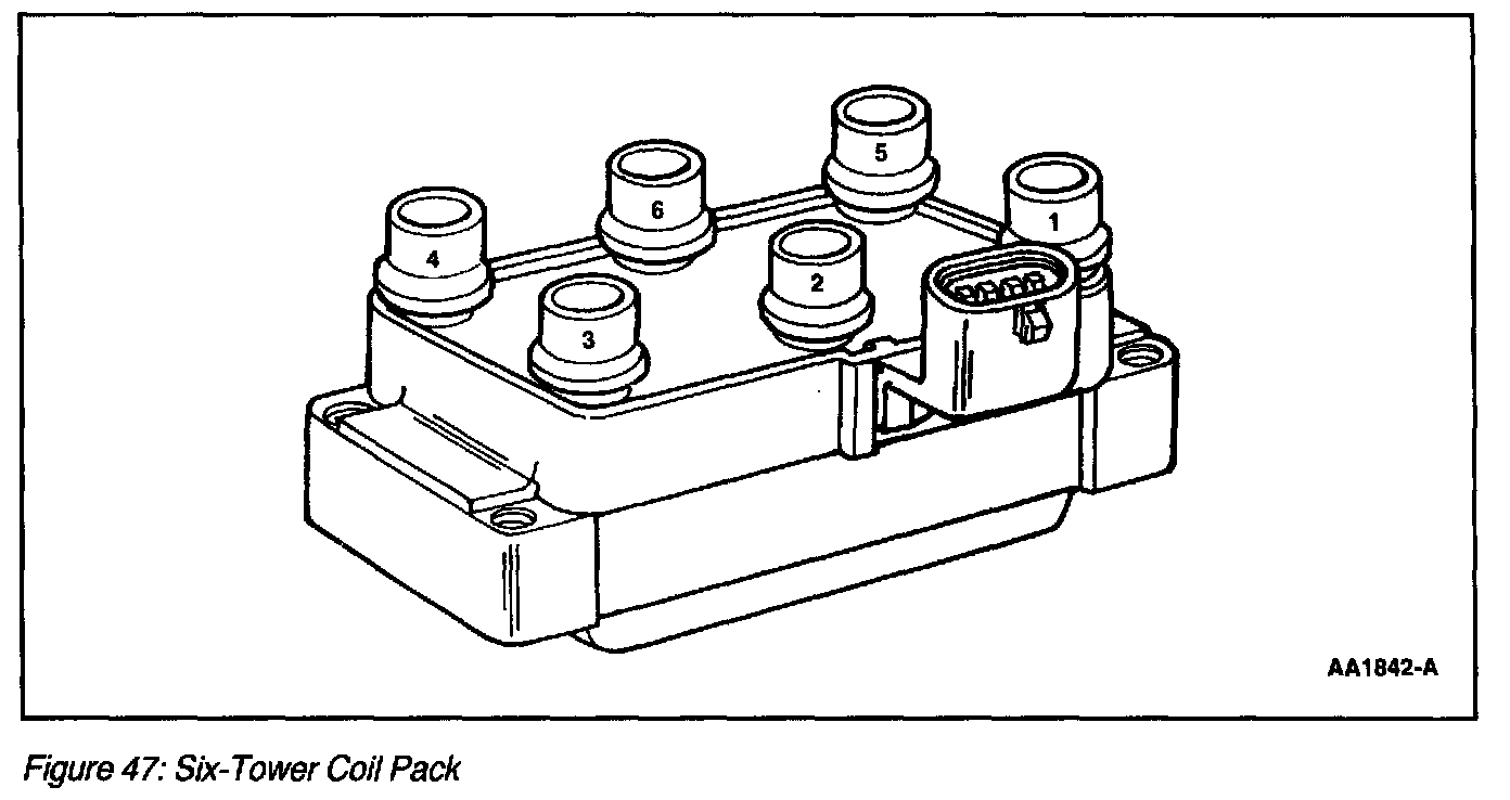 A coil in a coil pack (Figure 47) is turned on (for example is coil charging) by the PCM, and is turned off when firing two spark plugs at once. The spark plugs are paired so that as one spark plug fires on the compression stroke, the other spark plug fires on the exhaust stroke. The next time the coil is fired the order is reversed. The next pair of spark plugs fire according to the engine firing order.