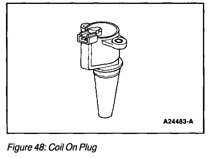The Coil On Plug (COP) (Figure 48) ignition operates similar to standard coil pack ignition except each plug has one coil per plug. COP has three different modes of operation: engine crank, engine running, and Camshaft Position (CMP) Failure Mode Effects Management (FMEM).