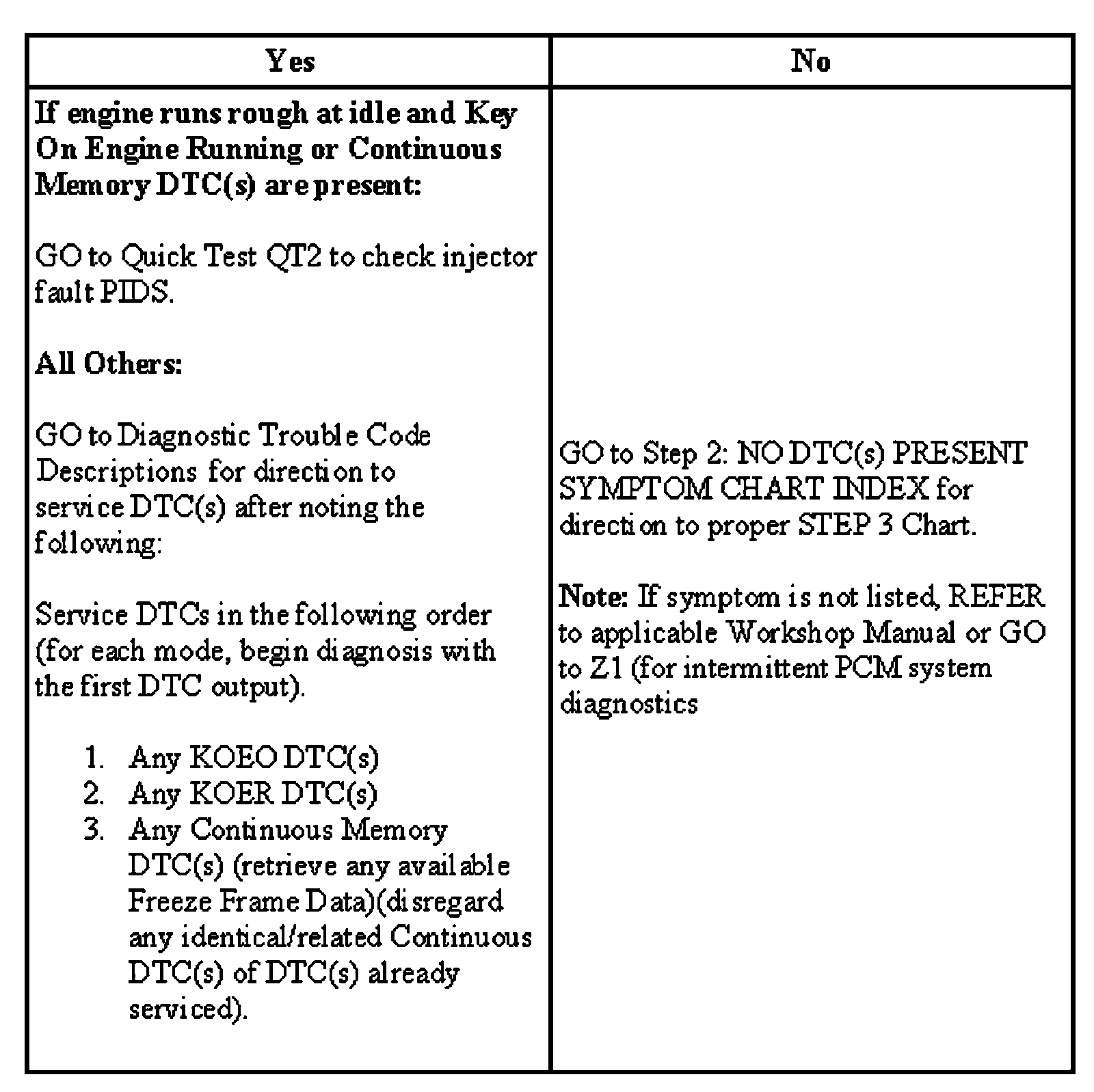 - Complete PCM Quick Test to access any DTCs. Note any Key On Engine Off, Key On Engine Running (if engine runs) and Continuous Memory (MIL and non-MIL) DTCs.