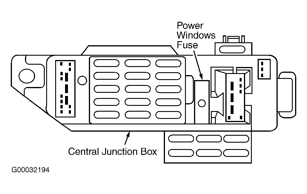 NOTE: For location of Central Junction Box (CJB) harness connectors and relay box, refer to illustration. See Fig 1. For location of power window fuse in CJB, refer to illustration. See Fig 2. Power window fuse may also be referred to as power window circuit breaker.