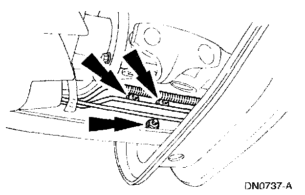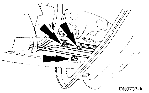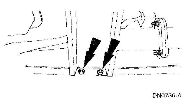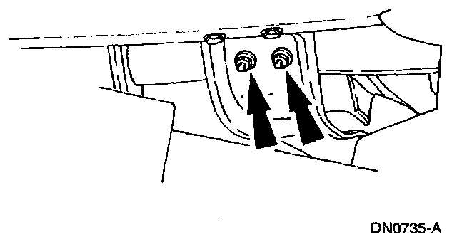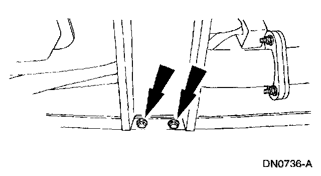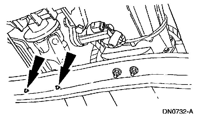 7. Remove the transmission support crossmember nuts and bolts (RH side).