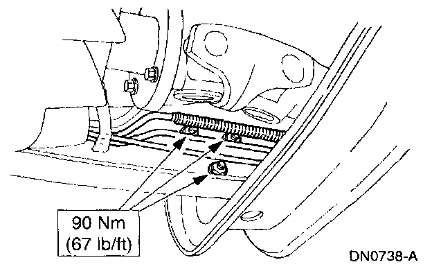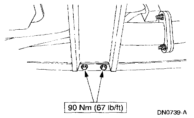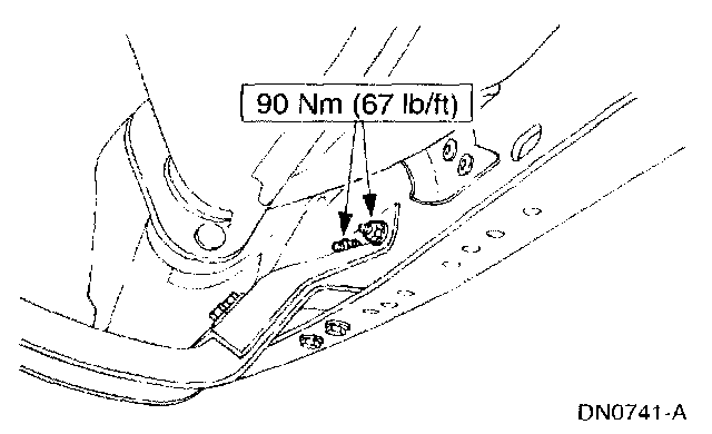 7. Tighten the transmission support crossmember nuts and bolts (RH side) to specification.