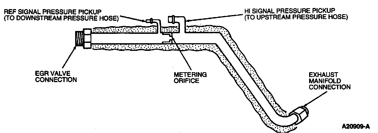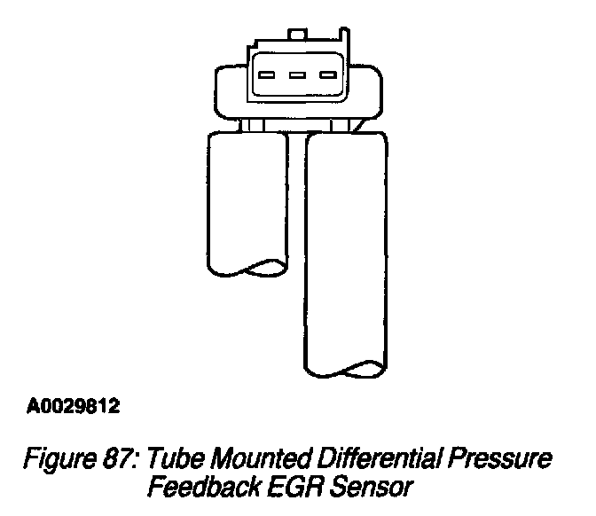 The orifice tube assembly (Figure 90) is a section of tubing connecting the exhaust system to the intake manifold. The assembly provides the flow path for the EGR to the intake manifold and also contains the metering orifice and two pressure pick-up tubes. The internal metering orifice creates a measurable pressure drop across it as the EGR valve opens and closes. This pressure differential across the orifice is picked up by the differential pressure feedback EGR sensor which provides feedback to the PCM.