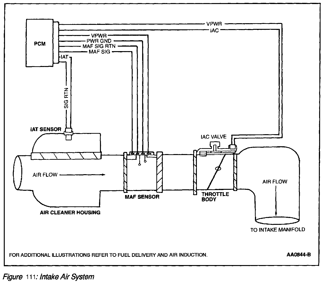 The throttle body system meters air to the engine during idle, part throttle, and Wide Open Throttle (WOT) conditions. The throttle body system consists of an Idle Air Control (IAC) valve assembly, idle air orifice, single or dual bores with butterfly valve throttle plates and a Throttle Position (TP) sensor. One other source of idle air flow is the Positive Crankcase Ventilation (PCV) system. The combined idle air flow (from idle air orifice IAC flow and PCV flow) is measured by the MAF sensor on all applications.