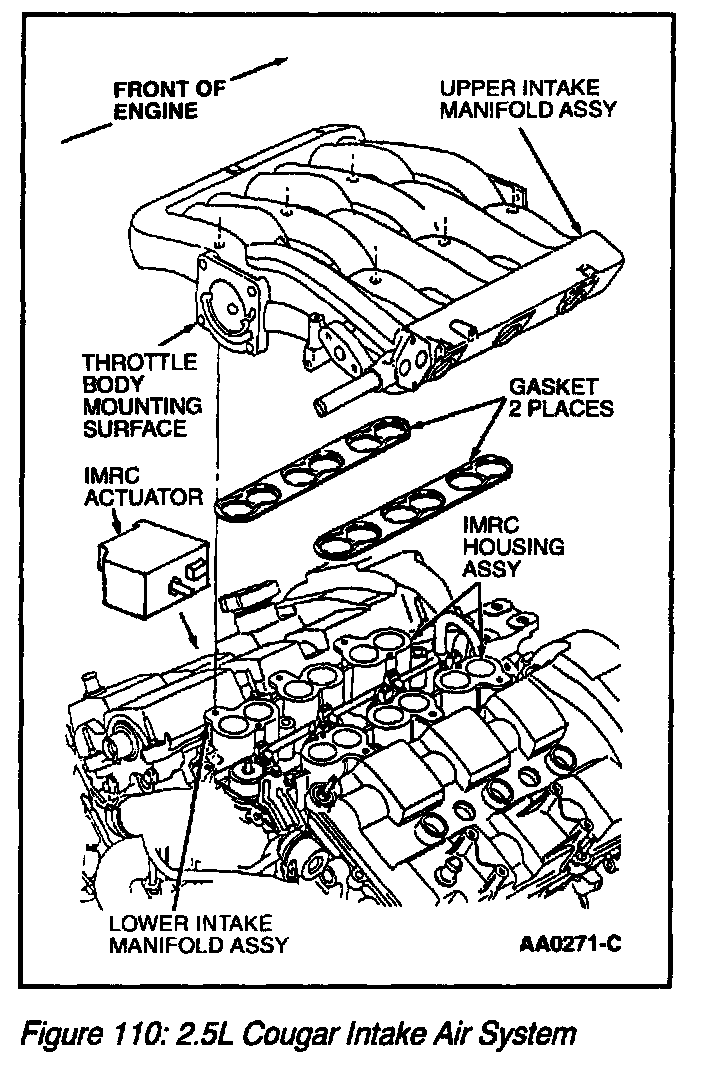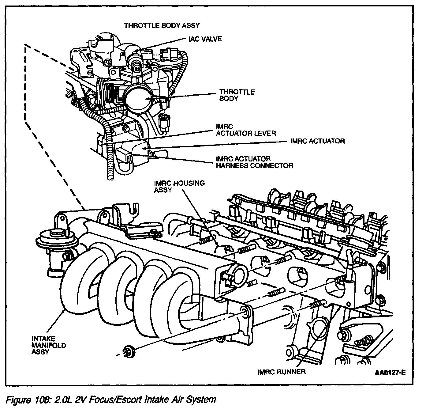 The Intake Manifold Runner Control (IMRC) Electric Actuated system (Figure 105) consists of a remote mounted motorized actuator with an attaching cable for each housing on each bank. Some applications will use one cable for both banks. The cable or linkage attaches to the housing butterfly plate levers. The 2.0L (2V) Focus/Escort IMRC uses a motorized actuator mounted directly to a single housing without the use of a cable. Each IMRC housing is an aluminum casting with two intake air passages for each cylinder. One passage is always open and the other is opened and closed with a butterfly valve plate. The housing uses a return spring to hold the butterfly valve plates closed. The motorized actuator houses an internal switch or switches, depending on the application, to provide feedback to the PCM indicating cable and butterfly valve plate position.