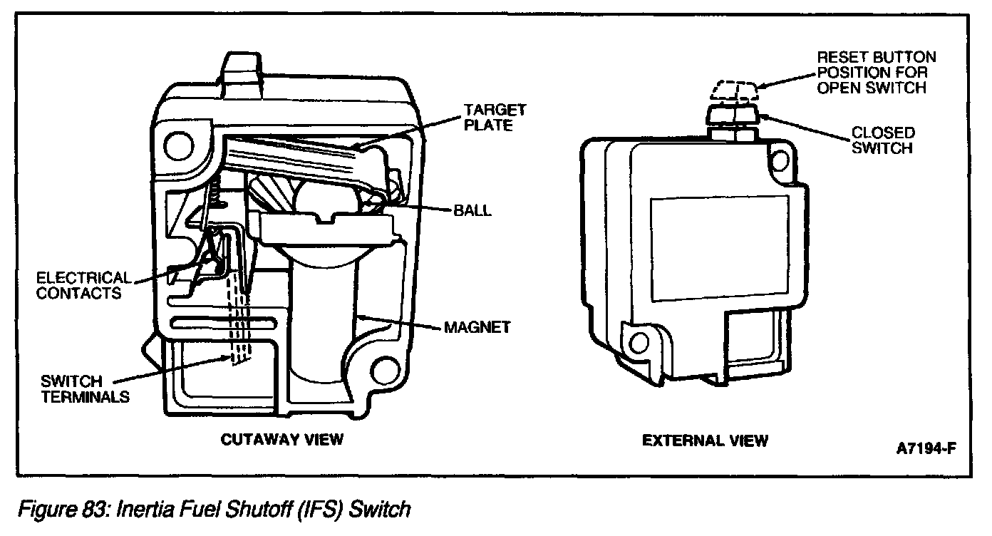 The inertia fuel shutoff (IFS) switch (Figure 83) is used in conjunction with electric fuel close valves. The purpose of the IFS switch is to close the fuel shut-off valves if a crash occurs. It consists of a steel ball held in place by a magnet. When a sharp impact occurs, the ball breaks loose from the magnet, rolls up a conical ramp and strikes a target plate which opens the electrical contacts of the switch and closes the electric fuel shut-off valve. Once the switch Is open, it must be manually reset before restarting the vehicle. On some vehicles a fuel reset light illuminates. Refer to the Owner Guide for the location of the IFS.