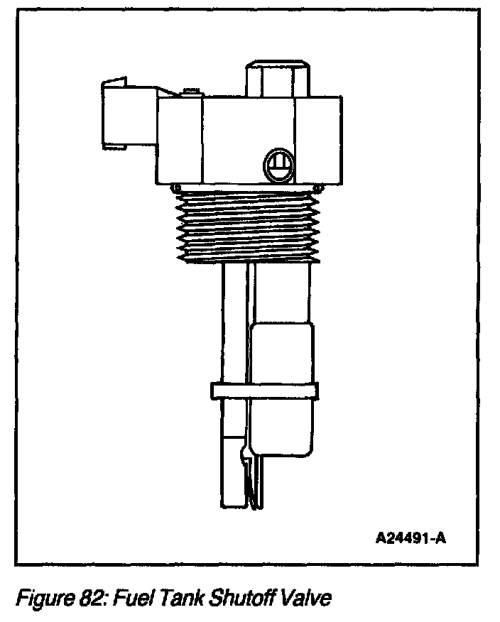 The fuel tank shutoff solenoid valve (Figure 82) is located in the fuel tank. The solenoid valves are on the same circuit as the gasoline fuel pump and utilize the same Inertia fuel shutoff (IFS) switch as gasoline. When the key is in the off position, the shutoff valves are closed and fuel in the tanks is isolated. During refueling, the shutoff valve acts as a check valve and allows flow due to pressure differential between the fuel being added from the fill station and the fuel in the tank.
