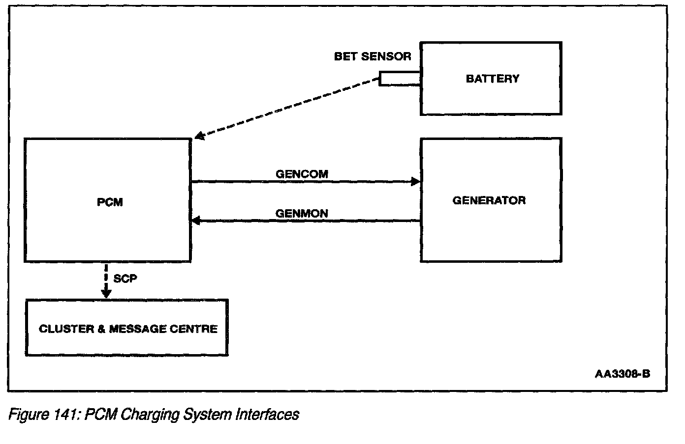 The Powertrain Control Module (PCM)-Controlled charging system (Figure 141) provides many additional benefits over the current Integral Generator Regulator system. The first benefit is improved battery life. In an integral generator regulator system, the regulator set point is established by a temperature sensor in the regulator which estimates battery temperature. Field data has shown this approach lacks accuracy. With a PCM-controlled generator, the regulator voltage set point is determined by the PCM and communicated to the regulator via the generator communication line. The PCM will use a calibratable algorithm to estimate battery temperature. Improving battery temperature estimates will reduce battery damage caused by over- and undercharging.