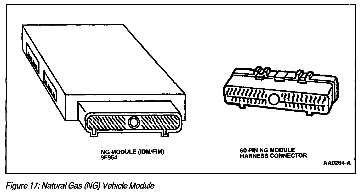The natural gas (NG) vehicle module (Figure 17) provides two functions. The first function operates the fuel injectors and is referred to as the Injector Driver Module (IDM). The second function sends a fuel level indicator signal to drive the fuel gauge and is called the Fuel Indicator Module (FIM). IDM NG vehicle fuel indicator driver signals are based on powertrain control module (PCM) fuel injector driver signals and are controlled directly by the corresponding injector drivers in the PCM. The IDM must be used to provide the NG fuel injectors with the required high current necessary for proper operation. The greater demand of NG fuel injector current warrants an increased size of the injector driver and increased heat dissipation. Given these conditions, the PCM would not be suitable for placement of these drivers. The IDM closely resembles the Electronic Engine Control IV PCM module in appearance.