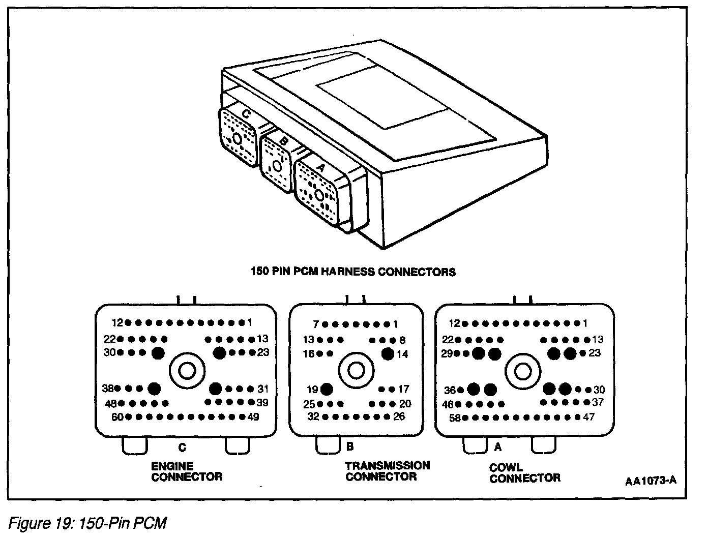 The center of the Electronic EC system is a microprocessor called the powertrain control module (PCM). The PCM receives input from sensors and other electronic components (switches, relays). Based on information received and programmed into its memory, the PCM generates output signals to control various relays, solenoids and actuators. Currently, there are two types of PCM's in use; a 150-pin PCM which has three separate electrical harness connectors (Figure 19) and a 104-pin PCM which has one electrical harness connector (Figure 18).