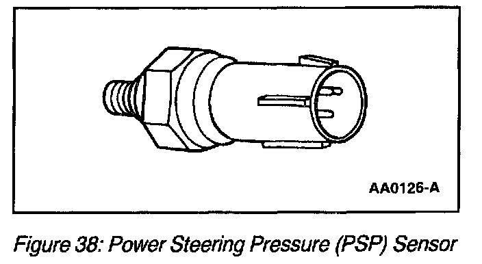 The power steering pressure (PSP) sensor (Figure 38) monitors the hydraulic pressure within the power steering system. The PSP sensor voltage input to the PCM will change as the hydraulic pressure changes. The PCM uses the input signal from the PSP sensor to compensate for additional loads on the engine by adjusting the idle rpm and preventing engine stall during parking maneuvers. Also, the PSP sensor signals the PCM to adjust transmission electronic pressure control (EPC) pressure during the increased engine load, for example during parking maneuvers.