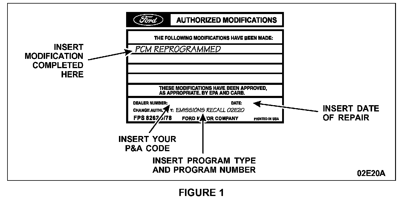 1. Obtain and prepare the Authorized Modifications label. Write the modification completed, your P&A code, date of repair and the recall program number in the spaces provided on the label. See Figure 1.