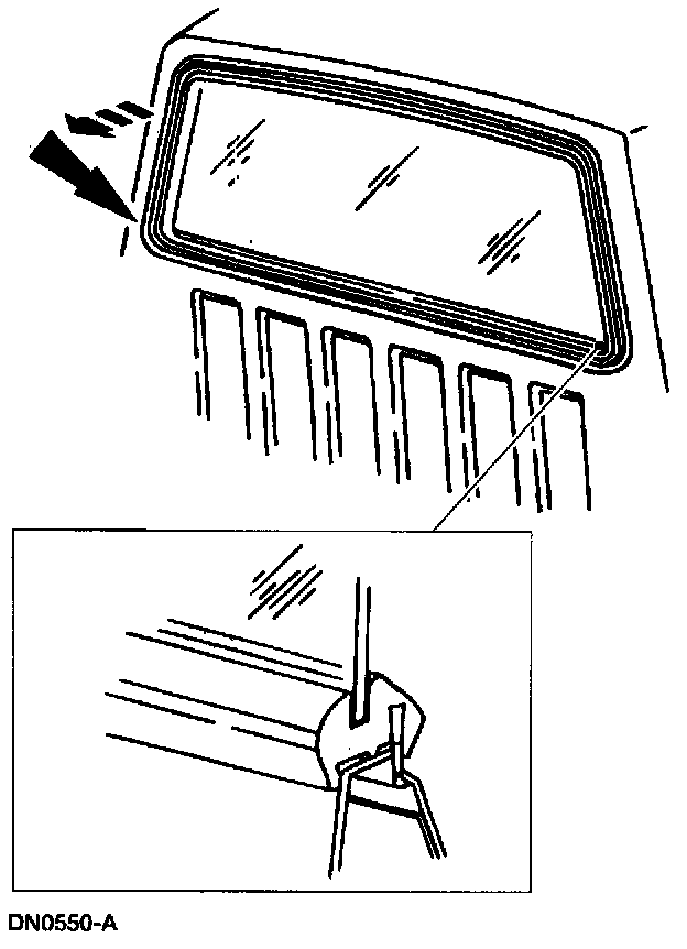 7. From inside the vehicle, pull down on the back window glass weatherstrip and push back the window glass and back window glass weatherstrip from the back window glass opening.
