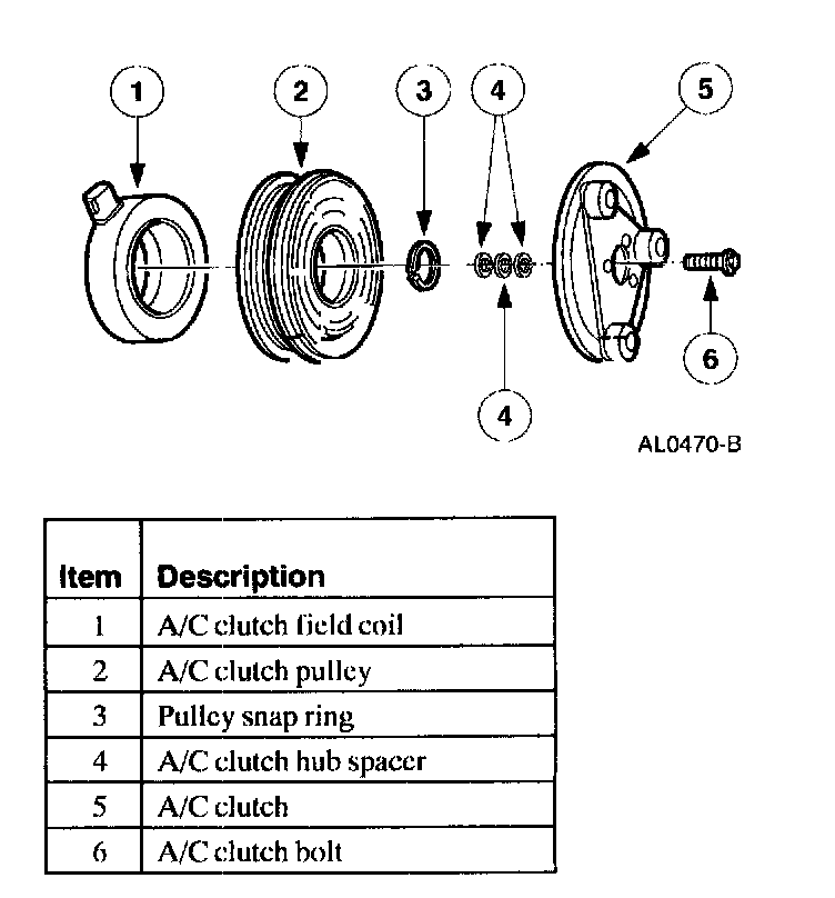 ^ Internal A/C compressor components are not serviced separately. The FS-10 A/C compressor is serviced only as an assembly. The A/C clutch, A/C clutch pulley, A/C clutch field coil and the shaft seal are serviceable.