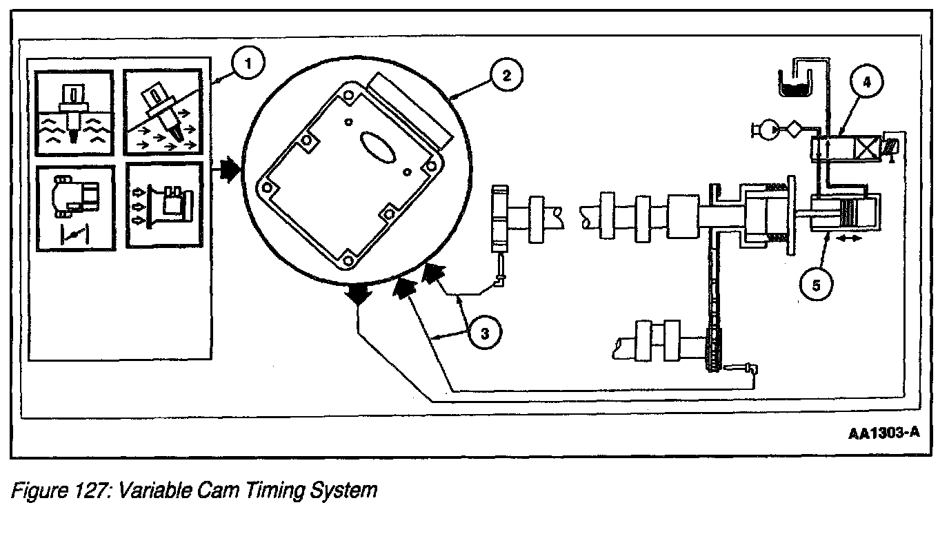 The Variable Cam Timing (VCT) System consists of the control solenoid, five-tooth pulse ring (4+1) on exhaust camshaft, Intake Air Temperature (IAT) sensor, Engine Coolant Temperature (ECT) sensor, Camshaft Position (CMP) sensor, Mass Air Flow (MAF) sensor, Crankshaft Position (CKP) sensor, Powertrain Control Module (PCM) (Figure 127).