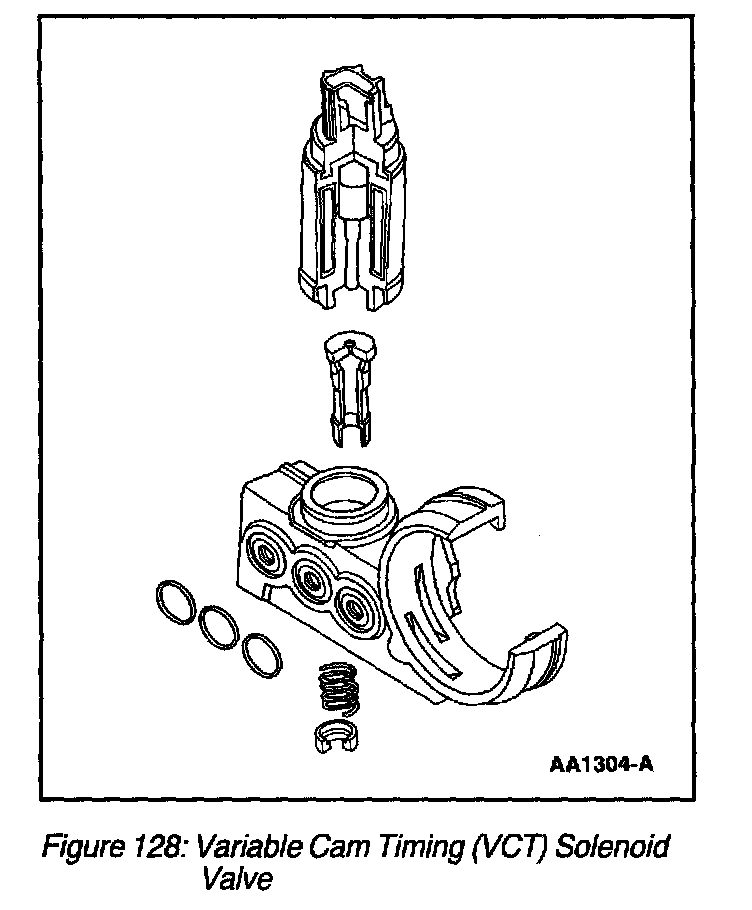 The VCT solenoid valve (Figure 128) is an integral part of the VCT system. The solenoid valve controls the flow of engine oil to the variable cam timing unit assembly. As the PCM duty cycles the solenoid valve, oil is allowed to flow to the VCT unit assembly and advance or retard the cam timing.