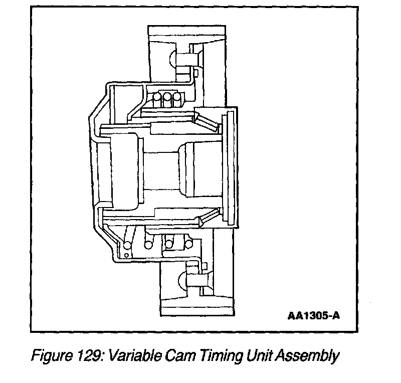 The variable cam timing unit assembly (Figure 129) is coupled to the camshaft through a helical spline in the VCT unit chamber. When the flow of oil is shifted from one side of the chamber to the other, the differential change in oil pressure forces the piston to move linearly along the axis of the camshaft. This linear motion is translated into rotational camshaft motion through the helical spline coupling. A spring installed in the chamber is designed to hold the camshaft in the minimum overlap position (5 degrees) when oil pressure is too low to maintain adequate position control. The camshaft is allowed to rotate up to 30 degrees.