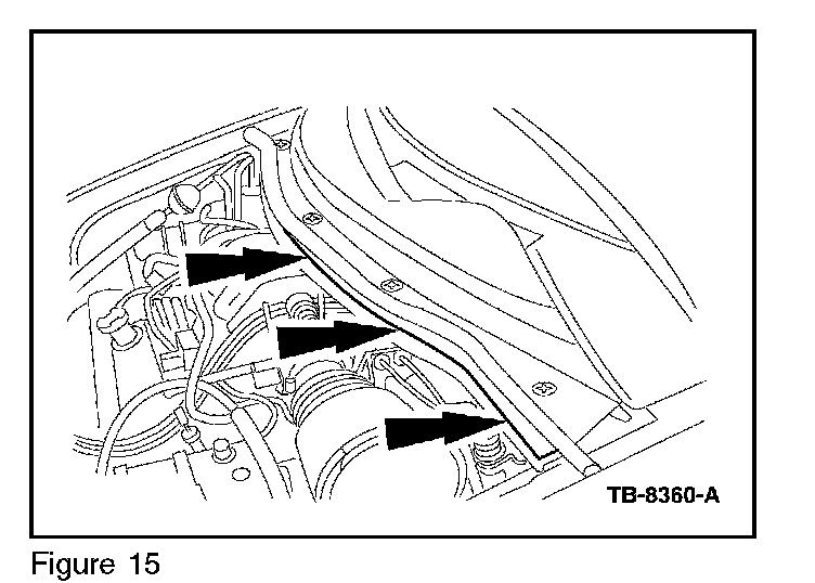 20. Add Clear Silicone Rubber to the front seam between the upper and lower cowl in the area above the transaxle. (Figure 15)