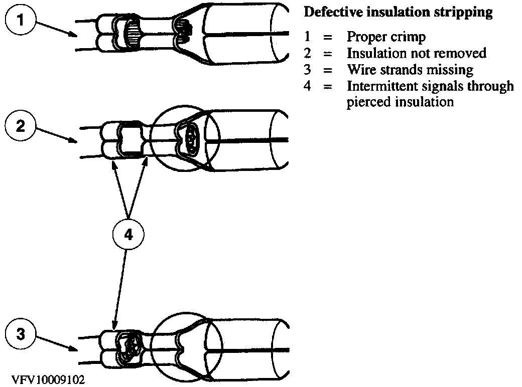 The illustrations are known examples of wiring harness, splices and connectors that will create intermittent electrical concerns. The concerns are hidden and can only be discovered by a physical evaluation in each illustration.