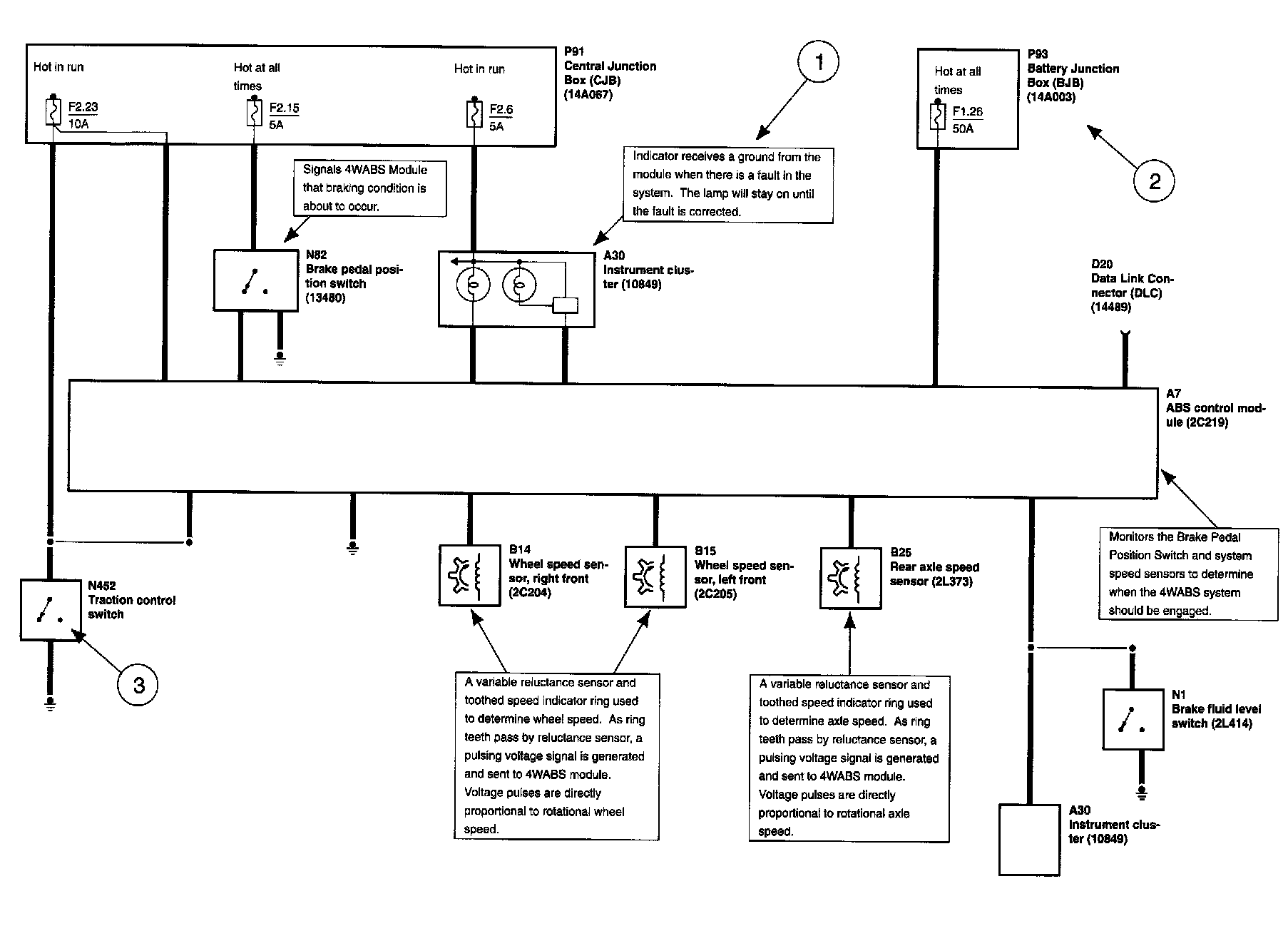 Each major vehicle system includes a complete system overview diagram prior to each set of diagrams. It is important to realize that this is only a high level overview of the complete system connectivity. It includes component operational information (1), component name and base part number (2), and basic component internals (3). It does not include specific circuit information, connector or pin numbers, splices or grounds. That information is found on the subsequent diagrams in the set.