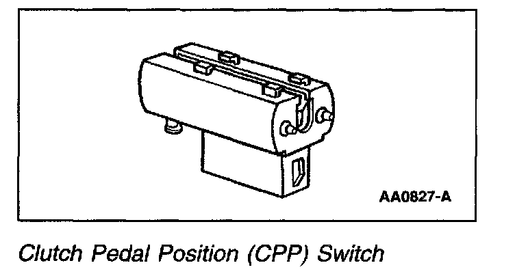 The Clutch Pedal Position (CPP) switch is an input to the Powertrain Control Module (PCM) indicating the clutch pedal position. The CPP sends battery voltage to the PCM when the clutch is engaged (foot off of pedal) and zero voltage when the clutch is disengaged (pedal depressed).