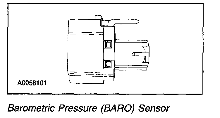 The Barometric Pressure (BARO) sensor is a variable capacitor sensor that processes a signal indicating atmospheric pressure. This allows the PCM to compensate for altitude. The PCM uses this information to calculate injection timing and glow plug control. The BARO sensor is located behind the lower steering column opening finish panel.
