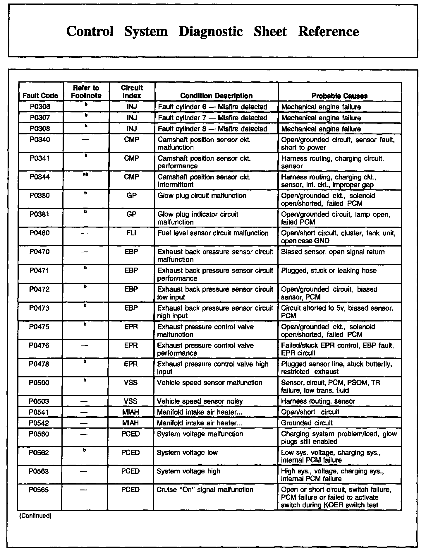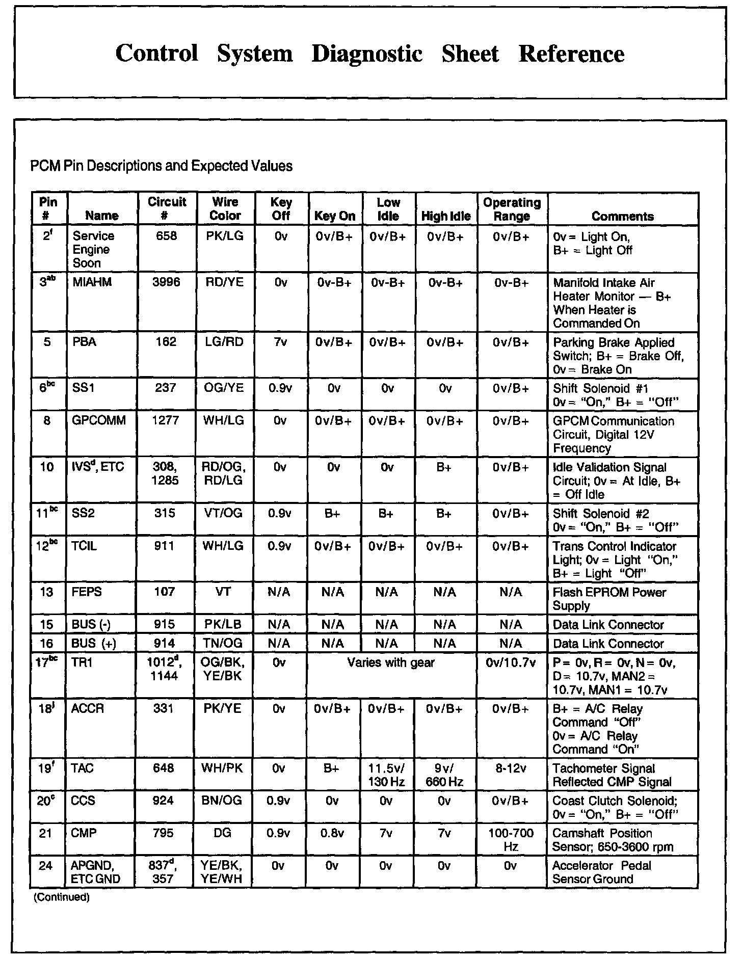 Control System Diagnostic Sheet Reference, Part 2: