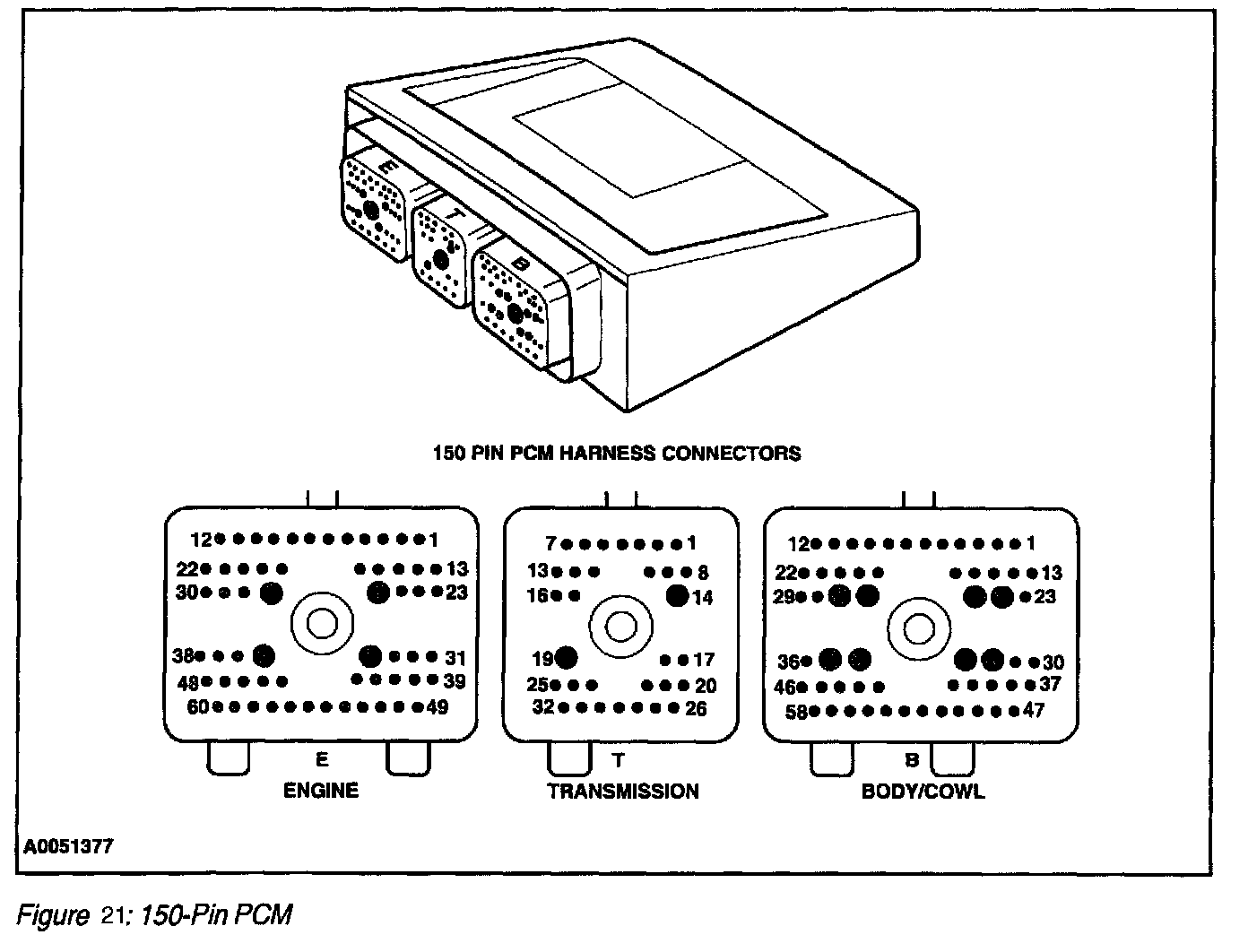 The center of the Electronic EC system is a microprocessor called the Powertrain Control Module (PCM). The PCM receives input from sensors and other electronic components (switches, relays). Based on information received and programmed into its memory, the PCM generates output signals to control various relays, solenoids and actuators. Currently, there are three types of PCM's in use; a 122-pin and 150-pin PCM which has three separate electrical harness connectors and a 104-pin PCM which has one electrical harness connector.